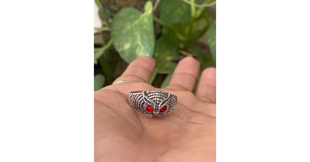 Oxidized Silver Owl Ring, Red CZ Eyes, Adjustable Boho Ring