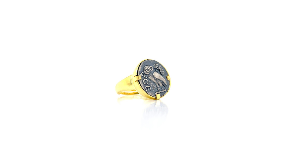 Adjustable Athena's Wisdom Owl Ring - Oxidized Silver Owl on Gold-plated Band