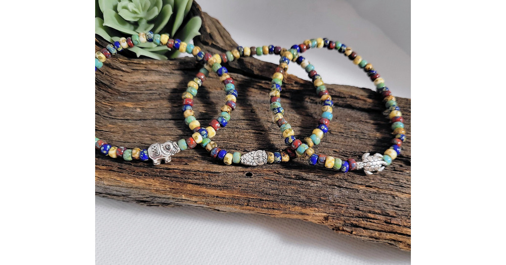 Beaded Bracelet with Elephant, Turtle or Owl Focal • Single or Two Piece Set • Artisan Col