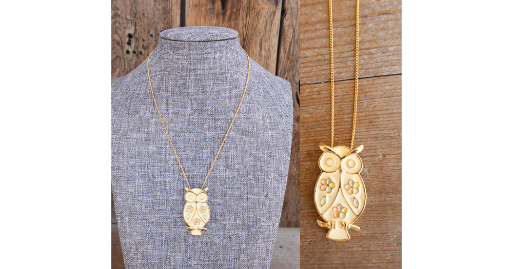 70s Gold Chain Enamel MCM Mid Century Owl Pendant Choker Necklace
