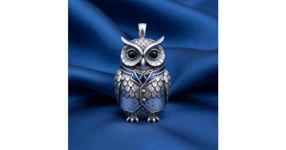 Owl Pendant Necklace Silver Blue Enamel Bird Charm with Black Eyes