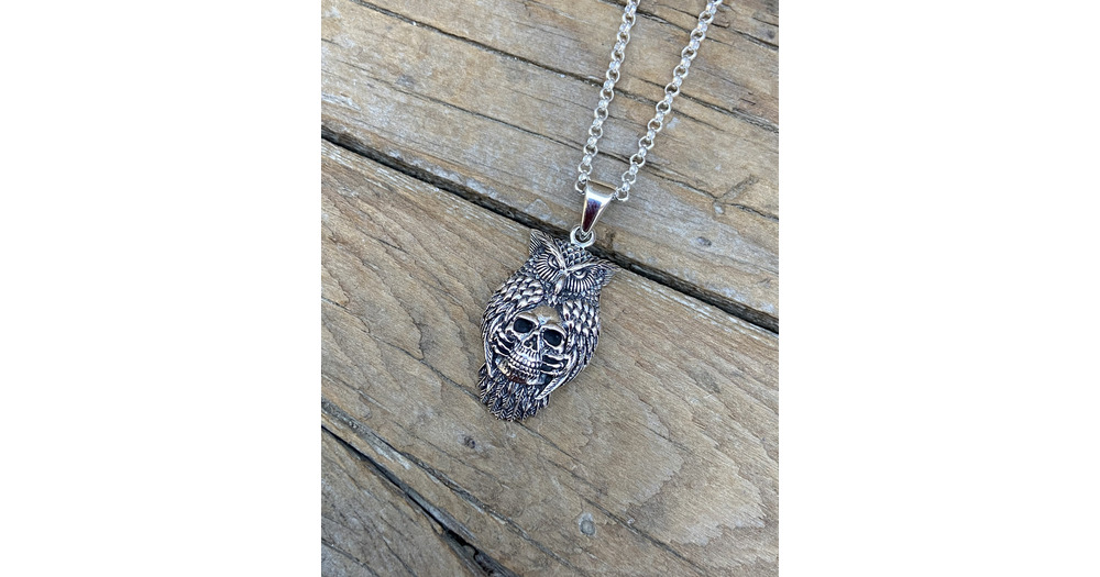Owl necklace handmade and antiqued in sterling silver 925 with a skull