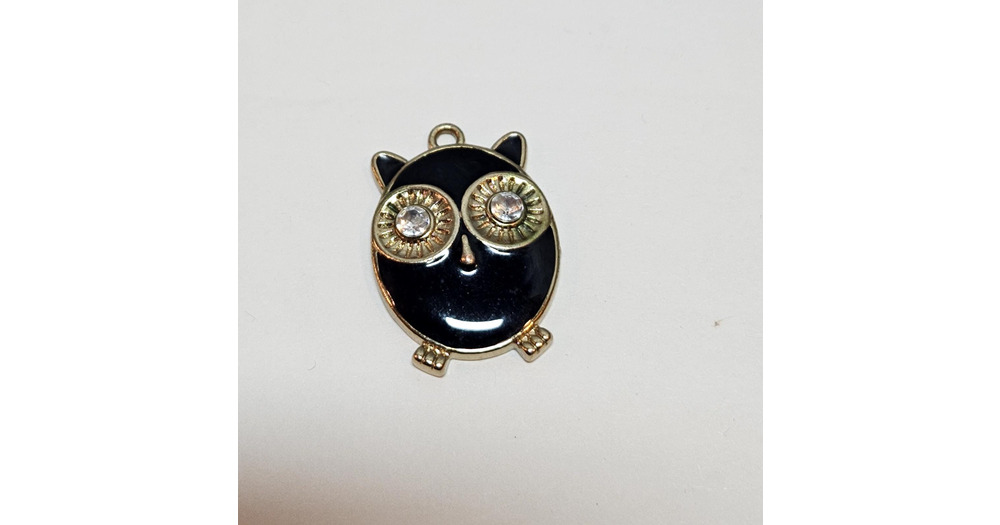 Vintage Black Enamel Owl Pendant Gold Tone Rhinestone Eyes Retro Charm 1"