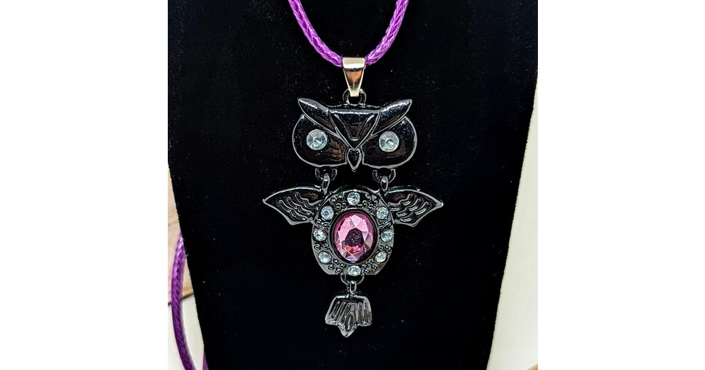 Vintage Gunmetal Gray Pink Crystal Owl Pendant Necklace~Repurposed Love Handcrafted
