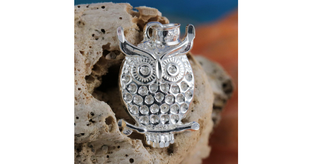 Sterling Silver Diamond cut Owl pendant, 11/16" + 1/4" bail. sitting on a perch.