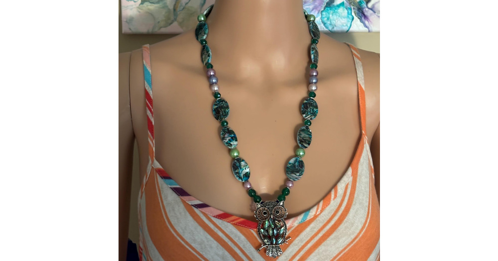 Beaded Necklace, Abalone Silver Owl Pendant