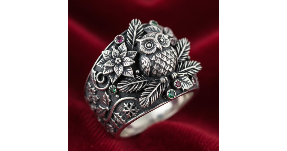 925 Sterling Silver Owl Statement Ring with Floral, Ruby & Green Gem Accents