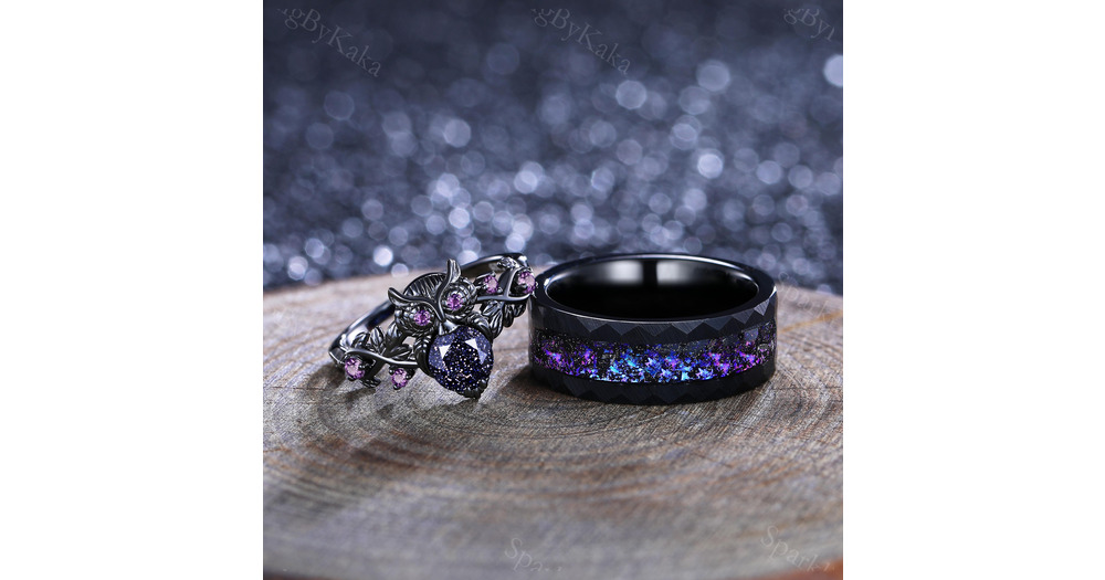 Blue Sandstone Owl Ring Set, Gothic Branch Design, Tungsten Wedding Band