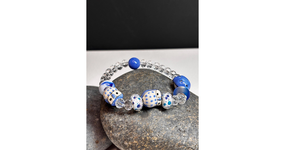 Ceramic Owl Bead Bracelet – Light Blue, Glass Beads, Boho Jewelry