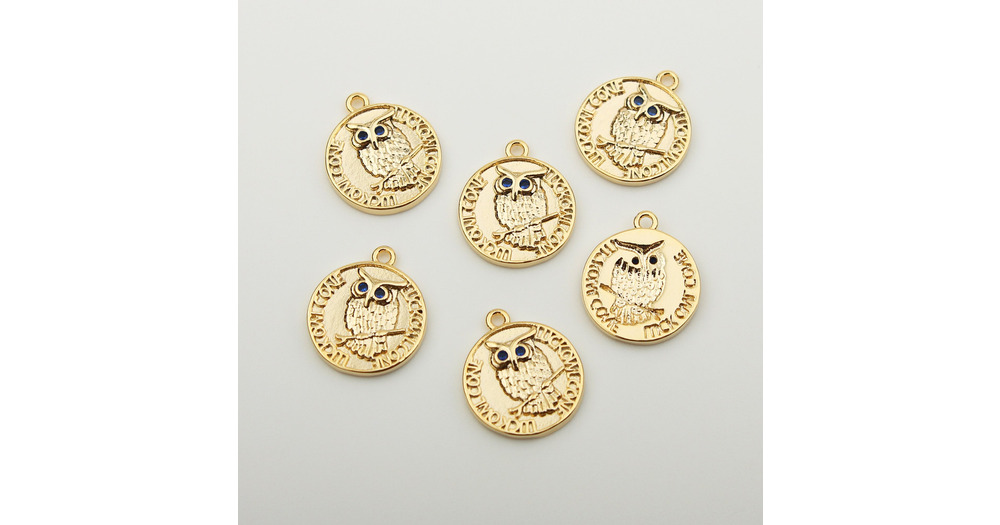 1PCS - Eagle-Owl with Blue Cubic Coin Charm, Night Owl Pendant, Owl Round Medal Pendant / BK9-0G