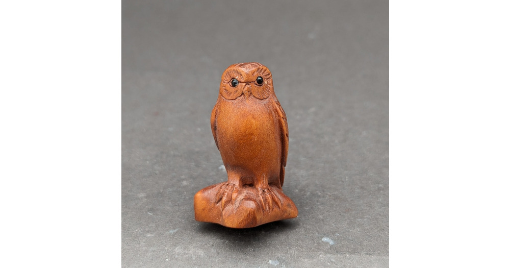 1 hand carved boxwood ojime: Owl, standing owl, symbol of wisdom, wood owl bead, wood owl charm, ver