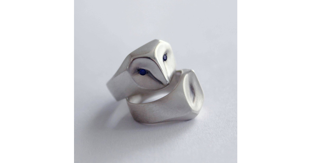 Sterling Silver Barn Owl Ring with Sapphire Eyes