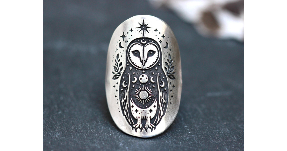 Celestial Barn Owl Ring - Sterling Silver Witchy Owl Jewelry – Dark Academia Ring – Stat