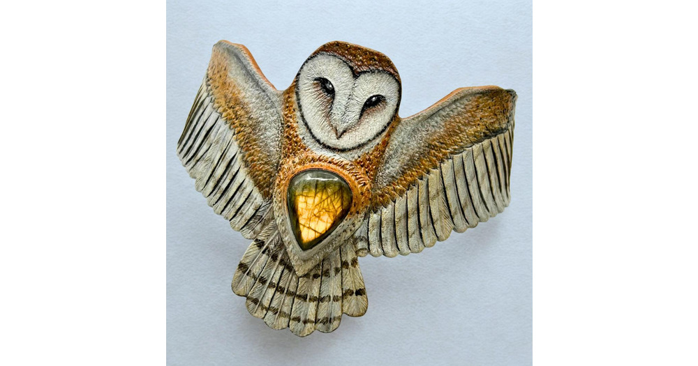 Hand Tooled Leather Barn Owl Cuff Bracelet: Golden Labradorite Cabochon