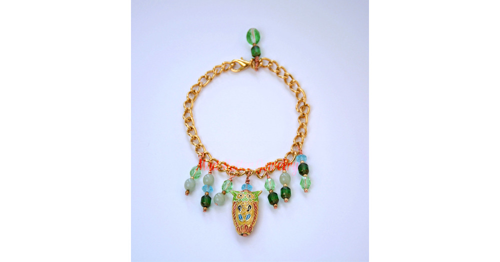 Cloisonné Owl Charm Bracelet: Beaded Dangles, Gold-Plated Chain