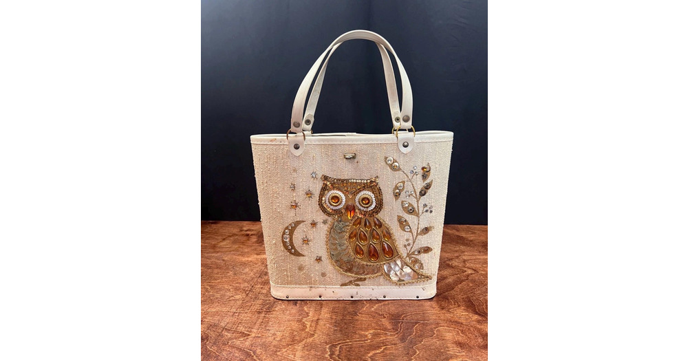 Vintage 1950s Handbag Rhinestone Owl & Wood Base Whimsical Bucket Purse