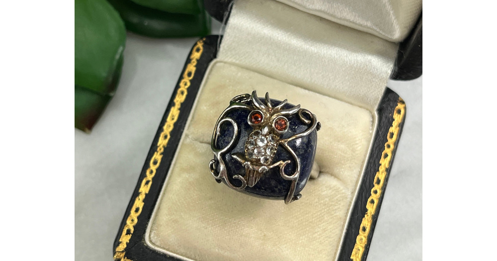 Sterling Silver Owl Ring – Lapis & CZ Statement Ring – Vintage Size 8