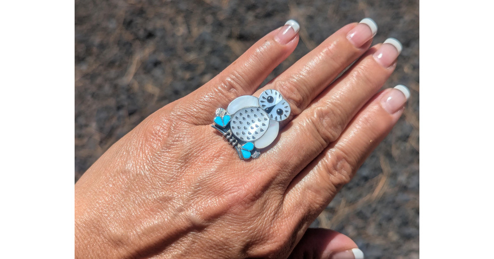 Zuni Inlay Owl Ring: Sterling Silver, Mother of Pearl, Native American Jewelry