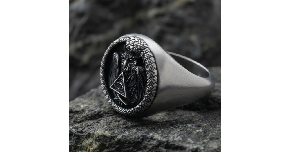 Eye of Providence Owl Ring 925 Sterling Silver Oxidized Finish Masonic Ouroboros Snake Gothic Occult