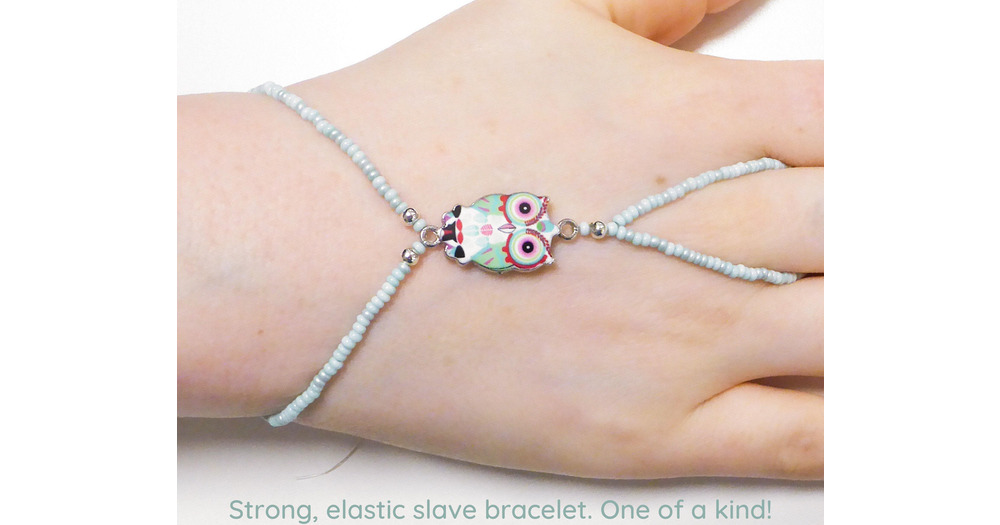 Cute turquoise red nickel free enamel owl. Pale turquoise elastic animal slave bracelet. Beaded stre