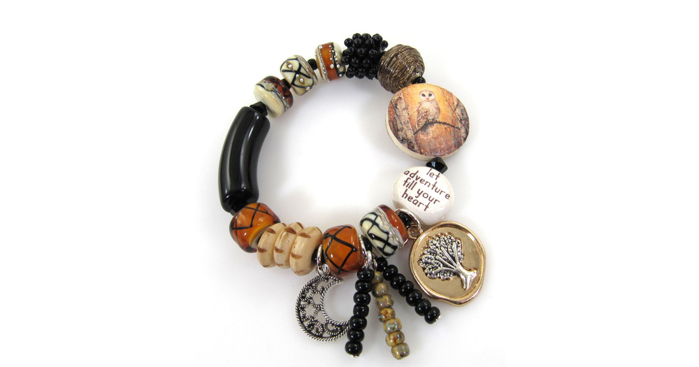 Woodland Owl Bracelet-Let Adventure Fill Your Heart Jewelry-Mixed Media Black, Amber and Ivory Stret