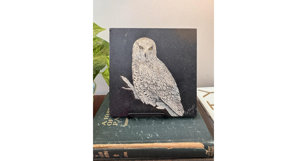 Vintage Snowy Owl Etched Slate Art Tile Signed Wildlife American Studio Craft Ray M Swartz 1970