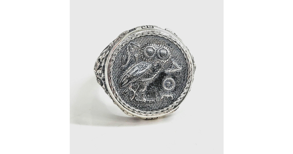 Sterling silver signet ring with Athenian owl, Greek replica coin jewelry