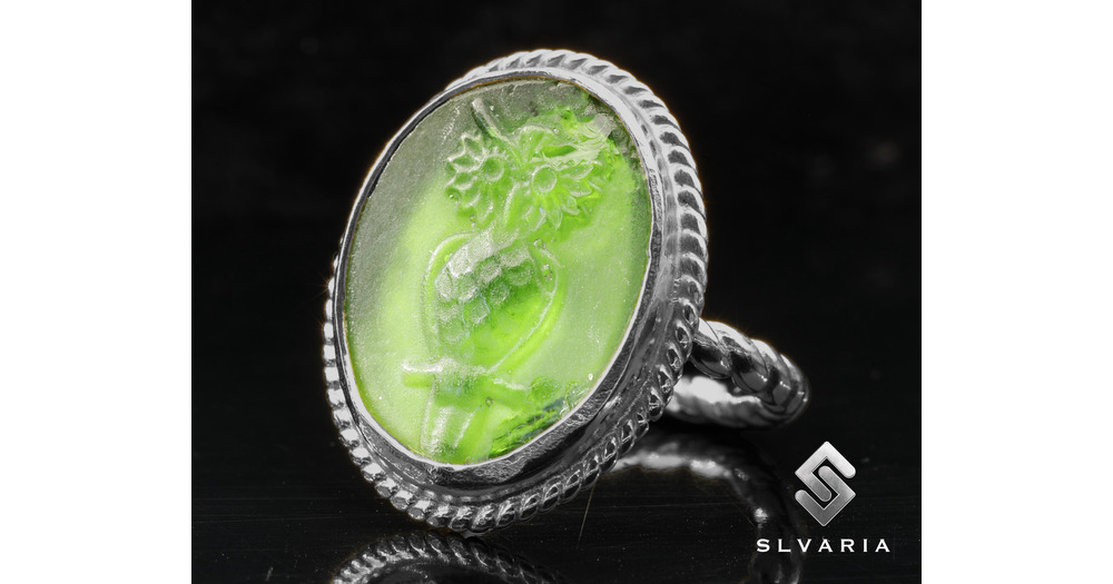 Black Owl Ring, Green Glass Intaglio Ring, Black Oxidized 925 Silver Ring, Handmade Signet Ring Bohe