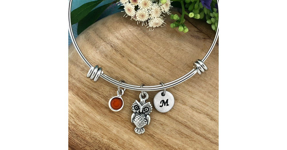 Owl Bracelet, Owl Jewelry, Adjustable Bangle, Crystal Birthstone, Personalised Hand Stamped initial,