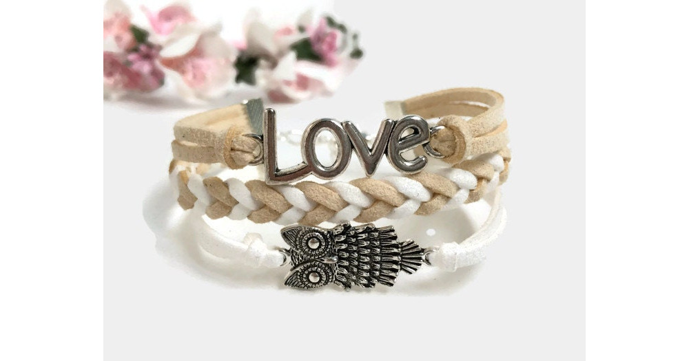 Love owl bracelet Beige brown white bracelet Silver owl bracelet Silver love bracelet Light brown br