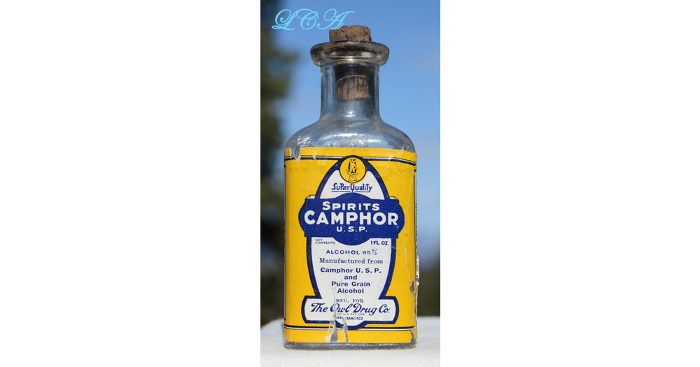 Antique OWL DRUG Co w/ original CAMPHOR paper label old Cork Top bottle 1 oz