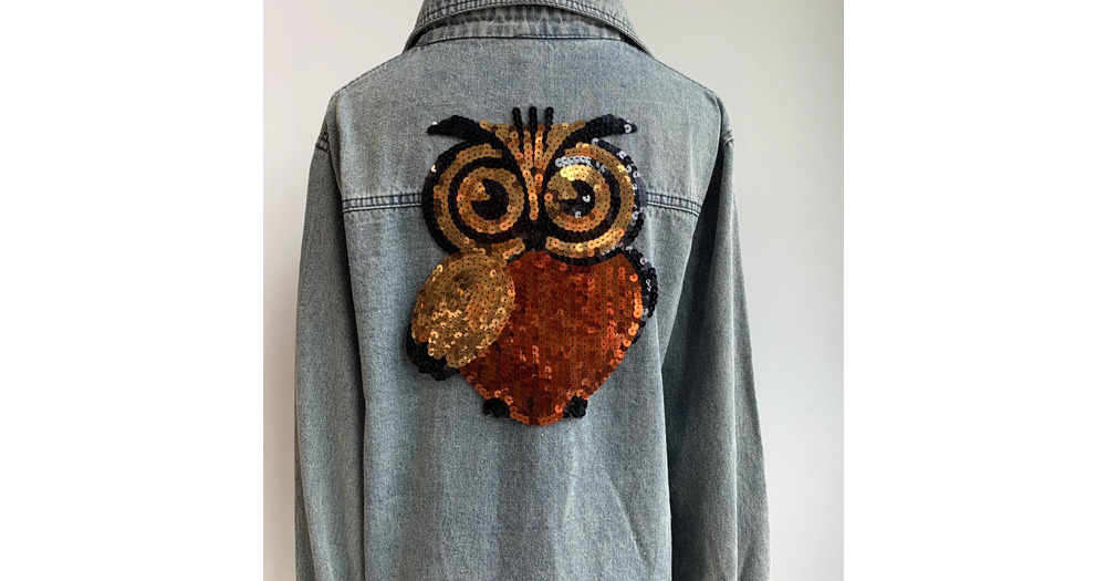 Large Golden Sequin Owl Appliqué | Shiny Coffee Iron-On Patch for Jackets back