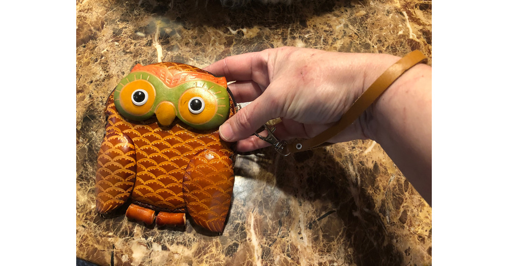 MINI OWL PURSE Vintage brown pressed leather purse wrist strap zipper closure