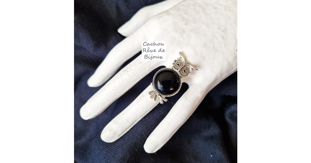 Bague Chouette hibou onyx noir naturel - Bague animaux réalistes avec monture fantaisie en m&