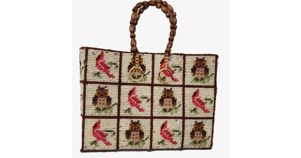 Vintage 1960s 70s OWL Patchwork Purse Handbag Cardinals Folk Art Needlepoint Wooden Bead Handle MCM