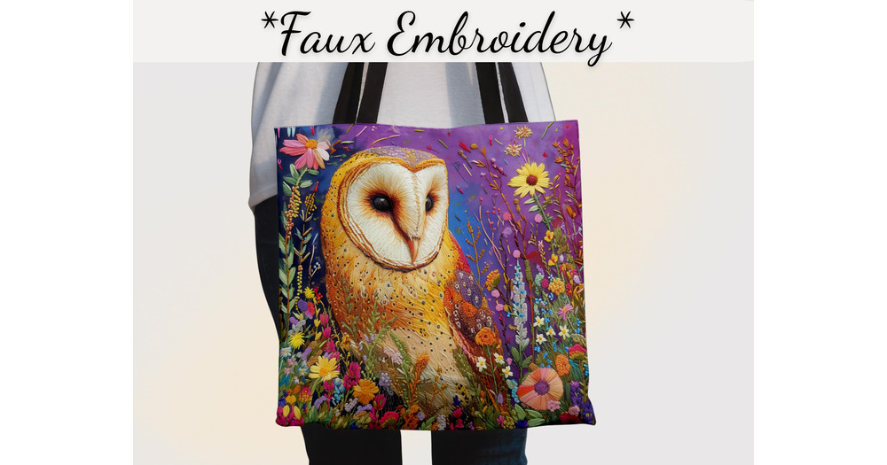 Faux Embroidered Floral Owl Tote - Whimsical Barn Owl Gift for Nature Lover - Cottagecore Shoulder B