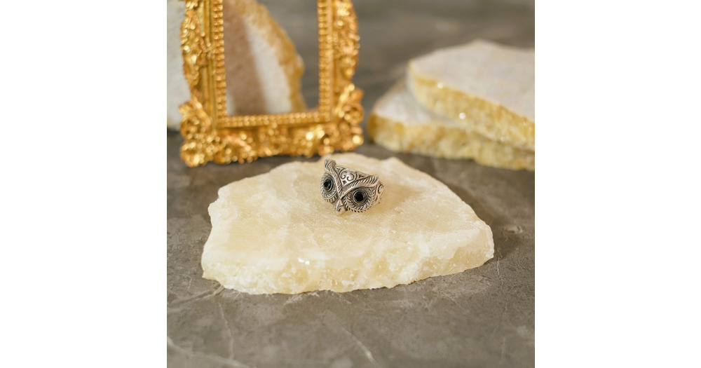 Sterling Silver Owl Ring: Black Onyx Eyes, Adjustable Band