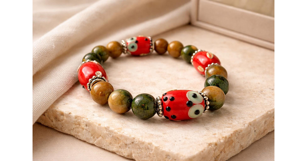 Hand‑Beaded Owl Bracelet • Whimsical Red & Green Bead Bracelet • Cute Nature‑Inspi