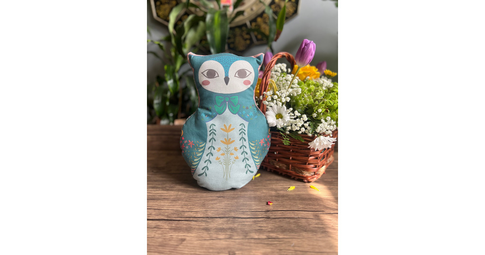 Catryoshka Teal Owl Nesting Doll Plush Pillow Original artwork with Vintage Out of Print fabric back