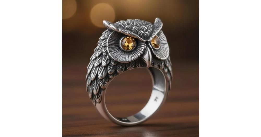 Owl Ring Silver Bird Statement Ring with Yellow Crystal Eyes Textured Feather Band