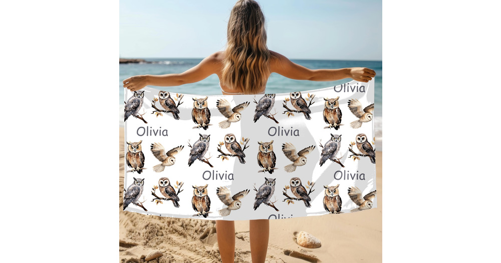 OWLS TOWEL, Personalized Barn Owl Towel Gift, Custom Name Horned Owl Beach Towel, Toddler Boy Bird T