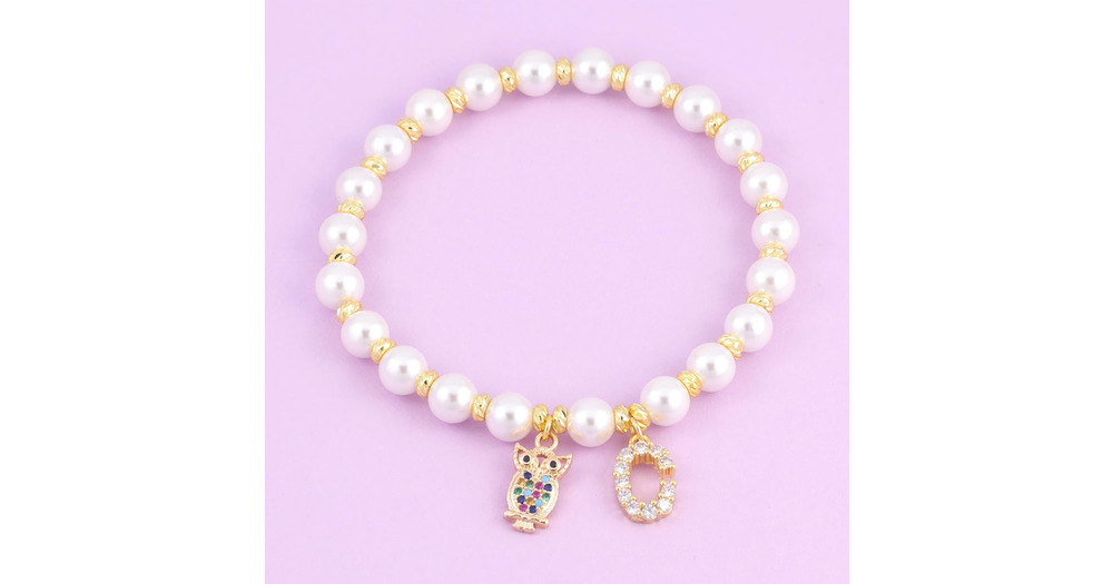 Owl Pearl Initial Bracelet ,dainty bracelet, Letter Jewelry, Gold Beaded,Anniversary Gift for Her