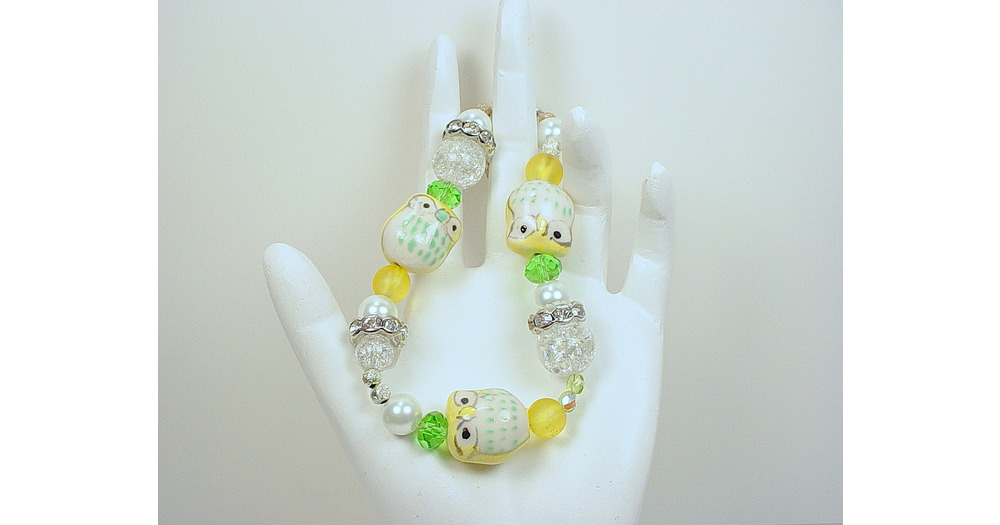 Owl Bracelet with Crystal, Glass, Rhinestone and Metal Beads in Tones of Green, Yellow and Silver w