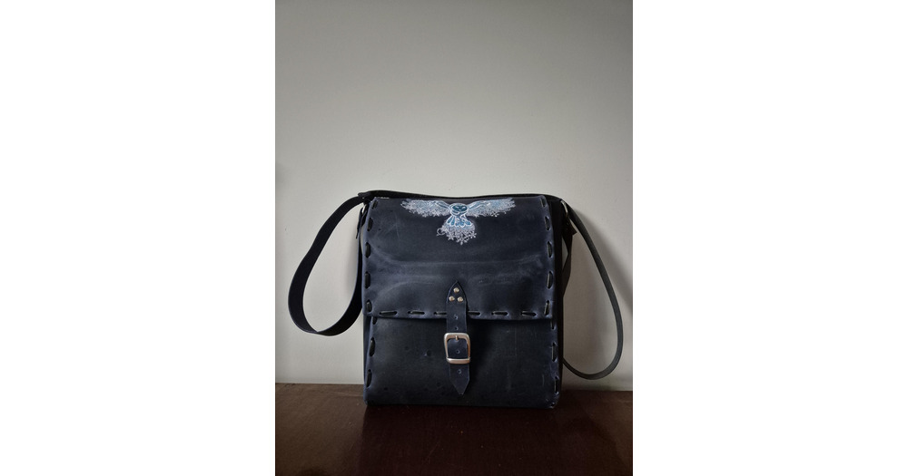 Blue Leather Shoulder Bag: Owl Embroidery, LARP Costume, Festival Clothing