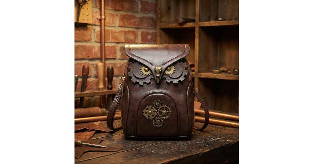 Steampunk Owl Crossbody Bag, Vintage Clockwork Gear Shoulder Purse, Brown Vegan Leather Bird Messeng
