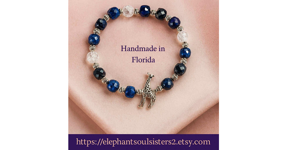 Giraffe, Owl or Cross Charm Bracelet, Dark Blue Cracked Glass Beads, Silver Accents