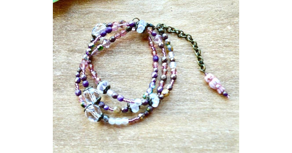 Pink Beaded Wrap Bracelet: Antique Brass Owl Charm, Boho Jewelry