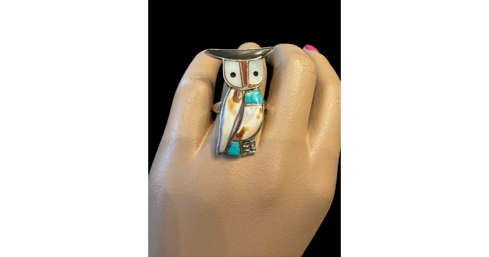 Sterling silver native style inlaid natural stone Owl ring Size 6