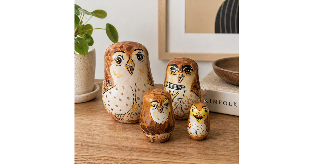 Vintage Handpainted Wooden Owl Nesting Dolls, Matryoshka Dolls