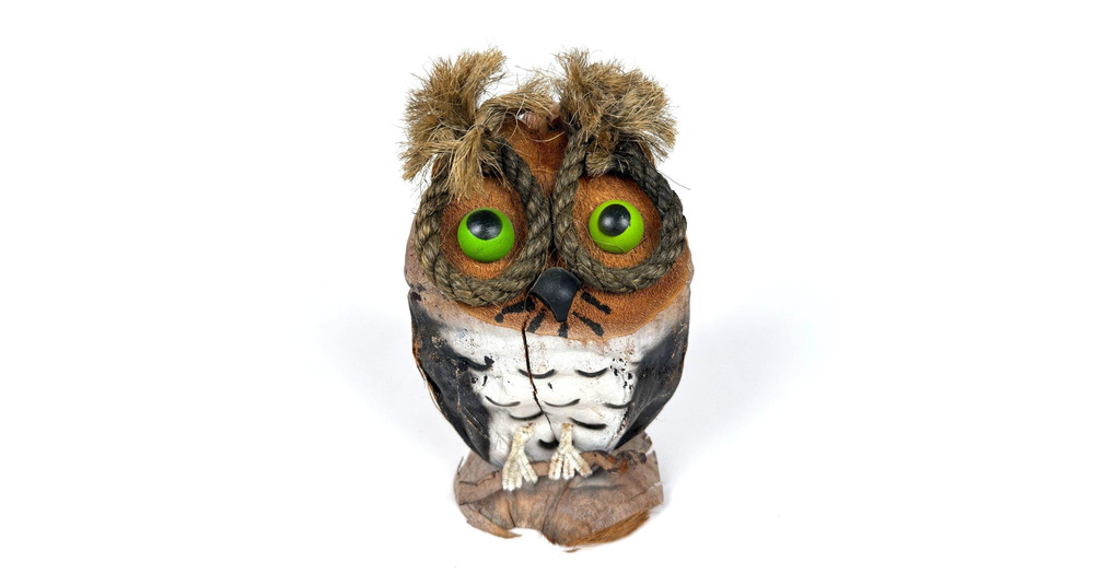 Coconut Owl Figurine: Handcrafted Rustic Decor with Green Eyes